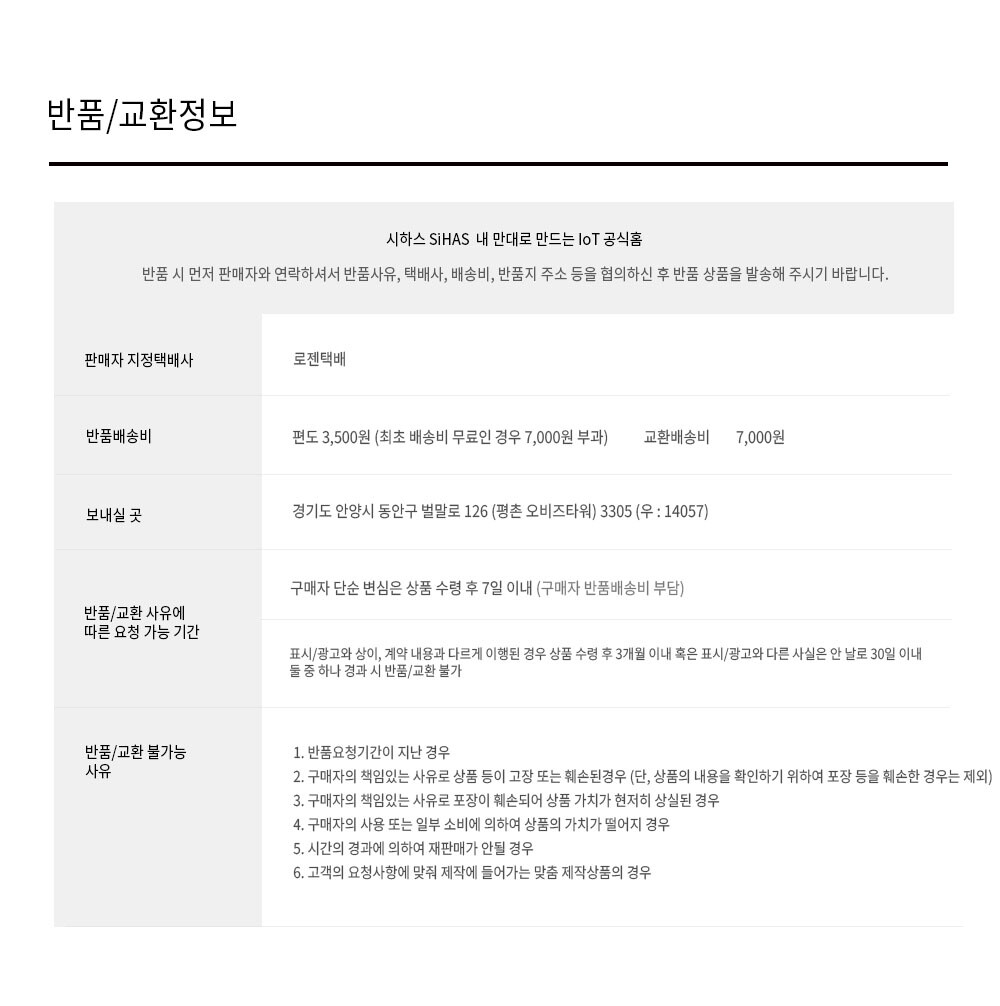 제품 구매 후 (제품을 사용, 설치하였거나 포장을 훼손한 경우) 교환, 반품이 불가능합니다.